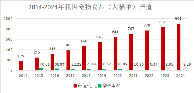 2014年至2024年我國(guó)寵物食品(犬貓糧)產(chǎn)值分析圖 (中國(guó)農(nóng)業(yè)科學(xué)院飼料研究所寵物營(yíng)養(yǎng)團(tuán)隊(duì)供圖) 中國(guó)農(nóng)業(yè)科學(xué)院飼料研究所寵物營(yíng)養(yǎng)團(tuán)隊(duì)數(shù)據(jù)統(tǒng)計(jì)顯示,2024年我國(guó)寵物犬貓飼養(yǎng)量達(dá)1.4億只,寵物產(chǎn)業(yè)總規(guī)模突破3000億元,其中寵物食品市場(chǎng)占比最高。到2024年,寵物食品犬貓糧市場(chǎng)規(guī)模達(dá)到900億元,比2023年增長(zhǎng)8.3%。 中國(guó)飼料工業(yè)協(xié)會(huì)數(shù)據(jù)顯示,2024年全國(guó)寵物飼料(主糧)產(chǎn)量達(dá)160萬(wàn)噸,比五年前增長(zhǎng)66.7%,連續(xù)多年保持兩位數(shù)增長(zhǎng)。2025年前7個(gè)月,產(chǎn)量達(dá)100.6萬(wàn)噸,同比增長(zhǎng)14.5%。 專家指出,中國(guó)寵物產(chǎn)業(yè)雖起步較晚,但發(fā)展迅猛,實(shí)現(xiàn)了從代工貼牌向自主創(chuàng)新的重大轉(zhuǎn)變。當(dāng)前,寵物產(chǎn)業(yè)正呈現(xiàn)出了諸多新趨勢(shì),如寵物食品走向品牌化、寵物用品趨向智能化、產(chǎn)業(yè)發(fā)展走向集群化、自主品牌加速國(guó)際化等。 寵物食品品牌化 寵物產(chǎn)業(yè),依傳統(tǒng)劃分為一、二、三產(chǎn)業(yè)。一產(chǎn)涵蓋寵物生產(chǎn)、繁育與銷售;二產(chǎn)涉及寵物用品、食品、藥品及相關(guān)器具設(shè)備的制造;三產(chǎn)包括寵物診療、美容等服務(wù)領(lǐng)域。 “作為產(chǎn)業(yè)鏈核心的寵物食品行業(yè),近年來(lái)市場(chǎng)規(guī)模持續(xù)擴(kuò)大。”中國(guó)飼料工業(yè)協(xié)會(huì)會(huì)長(zhǎng)王宗禮分析指出,2025年天貓“6·18”期間,寵物食品銷售額達(dá)75億元,同比增長(zhǎng)36%,新興品類增速超40%。