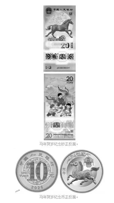 本次發(fā)行的2026年賀歲紀(jì)念幣面額10元,直徑27毫米,材質(zhì)為雙色銅合金材質(zhì),發(fā)行數(shù)量1億枚,正面為面額和年份,背面以剪紙風(fēng)格馬形象為主,輔以花燈和萱草圖案,壁面左側(cè)刊“丙午”字樣。紀(jì)念鈔面額20元,票面長(zhǎng)145毫米,寬70毫米,采用塑料材質(zhì),發(fā)行量1億張,正面為馬造型主景,背面描繪兒童歡慶鑼鼓場(chǎng)景,同時(shí)融合傳統(tǒng)裝飾和多民族文字元素。二者均為我國(guó)法定貨幣,每人預(yù)約、兌換限額均為20張(枚)。