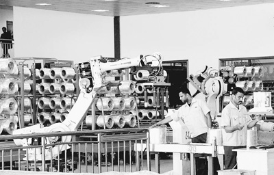 2015年,新蘇伊士運河的開通拉動了埃及的制造業(yè)和基礎(chǔ)設(shè)施建設(shè)。圖為在北非最大的玻璃纖維制造企業(yè)埃及巨石公司,埃及員工與“機械手臂”一同生產(chǎn)的場景。王云松攝