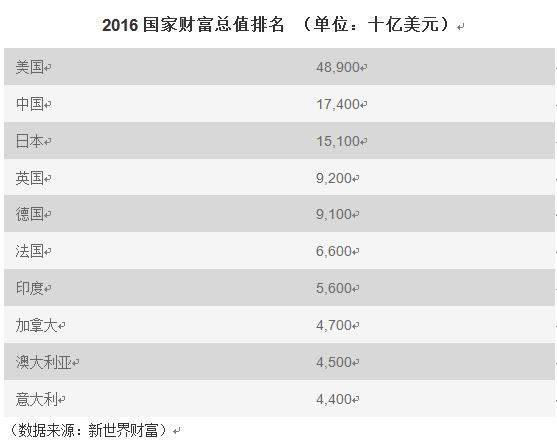 美國(guó)以48.9萬億美元(約合人民幣327萬億元)財(cái)富總值高居榜首,接下來依次是中國(guó)、日本、英國(guó)、德國(guó)、法國(guó)、印度、加拿大、澳大利亞和意大利。