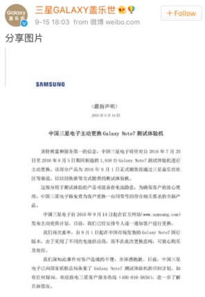 三星終于宣布:在中國(guó)大陸召回1858部Note7