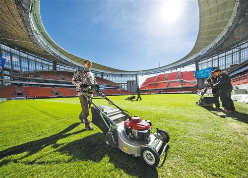 位于俄羅斯葉卡捷琳堡市中心的葉卡捷琳堡足球場(chǎng)始建于1953年,為迎接世界杯的到來(lái),場(chǎng)館在原有基礎(chǔ)上進(jìn)行改造。圖為葉卡捷琳堡體育場(chǎng)的工作人員正在修整草坪。 新華社記者 吳 壯攝