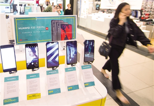 5月17日,在加拿大多倫多伊頓購(gòu)物中心,一名女子從銷售商展示的華為P20系列智能手機(jī)旁經(jīng)過(guò)。鄒 崢攝 (新華社發(fā))