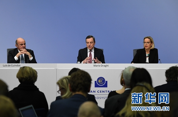 1月24日,在德國(guó)法蘭克福的歐洲中央銀行總部,歐洲央行行長(zhǎng)德拉吉(中)和副行長(zhǎng)德金多斯(左)出席新聞發(fā)布會(huì)。新華社記者 逯陽(yáng) 攝
