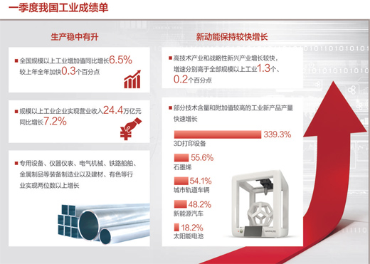 規(guī)模以上工業(yè)增加值同比增長(zhǎng)6.5%,較上年全年加快0.3個(gè)百分點(diǎn);制造業(yè)采購(gòu)經(jīng)理指數(shù)(PMI)重回?cái)U(kuò)張區(qū)間……今年一季度,面對(duì)復(fù)雜嚴(yán)峻的國(guó)內(nèi)外形勢(shì),我國(guó)經(jīng)濟(jì)運(yùn)行總體平穩(wěn)、好于預(yù)期,開(kāi)局良好,為全年經(jīng)濟(jì)持續(xù)穩(wěn)定健康發(fā)展打下了良好的基礎(chǔ)。