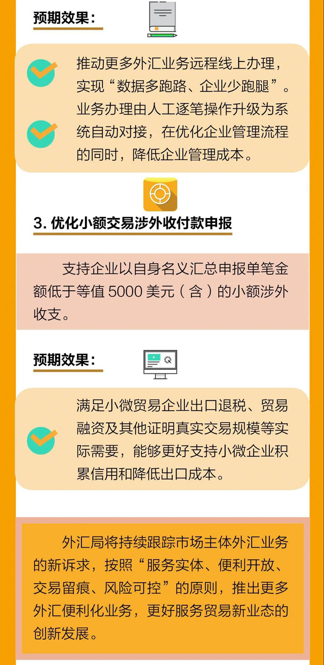 記者梳理發(fā)現(xiàn),《通知》包括9方面內(nèi)容,聚焦解決貿(mào)易新業(yè)態(tài)“小額、高頻、電子化”交易中結(jié)算不便捷問(wèn)題。政策設(shè)計(jì)上,遵循“鼓勵(lì)創(chuàng)新、包容審慎”原則,積極適應(yīng)貿(mào)易新業(yè)態(tài)發(fā)展的實(shí)際需要。按照“服務(wù)實(shí)體、便利開(kāi)放、交易留痕、風(fēng)險(xiǎn)可控”要求,放寬貿(mào)易新業(yè)態(tài)外匯政策,優(yōu)化外匯服務(wù),便利相關(guān)外匯業(yè)務(wù)辦理,實(shí)施“交易越合規(guī)、匯兌越便利”的信用約束和分類(lèi)管理。