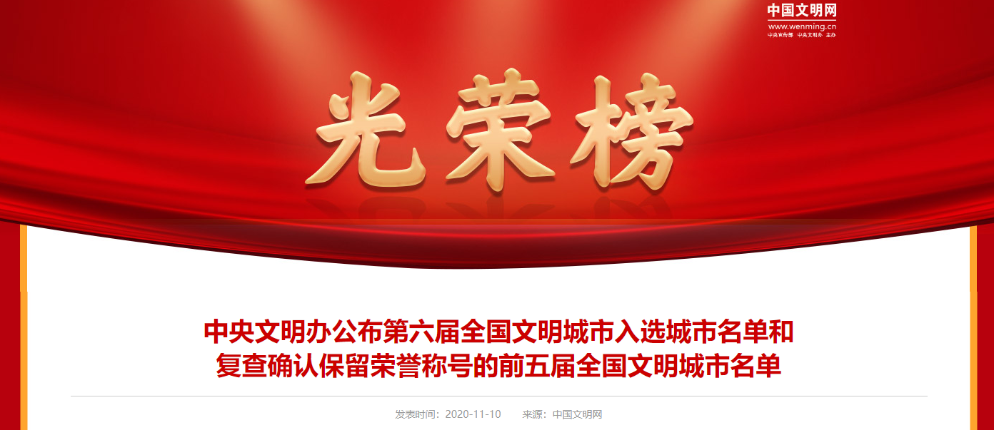2020年8月以來,中央文明辦按照城市自主申報、省級擇優(yōu)推薦、中央部委審核、媒體集中公示、組織綜合測評、確定入選城市等評選辦法和程序,嚴謹規(guī)范組織第六屆全國文明城市評選工作,嚴格依據(jù)參評城市2018、2019、2020年三年測評總成績排名,提出第六屆全國文明城市入選城市名單,報中央文明委領(lǐng)導同志批準。同時,中央文明辦按照城市自查、省級審核、中央把關(guān)、組織測評等復查辦法和程序,認真做好前五屆全國文明城市復查工作,嚴格依據(jù)全國文明城市復查測評成績,提出繼續(xù)保留榮譽稱號的全國文明城市名單,報中央文明委領(lǐng)導同志批準。現(xiàn)將第六屆全國文明城市入選城市名單和復查確認保留榮譽稱號的前五屆全國文明城市名單公布如下。