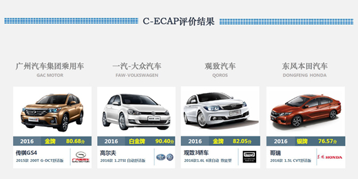 人民網(wǎng)天津3月9日電(鄂智超)日前,中國(guó)生態(tài)汽車評(píng)價(jià)(C-ECAP)新一批測(cè)試結(jié)果公布。本次共公布了四款車型,分別為一汽-大眾高爾夫 2016款 1.2TSI自動(dòng)舒適版(90.40分)、廣汽傳祺GS4 2015款 200T G-DCT舒適版(80.68分)、觀致3轎車 2016款1.6L 6速自動(dòng)致能型(82.05分)、東風(fēng)本田哥瑞 2016款1.5L CVT舒適版(76.57分)。其中一汽-大眾高爾夫車型獲得白金牌,廣汽傳祺GS4與觀致3轎車獲得金牌,東風(fēng)本田哥瑞獲銀牌。