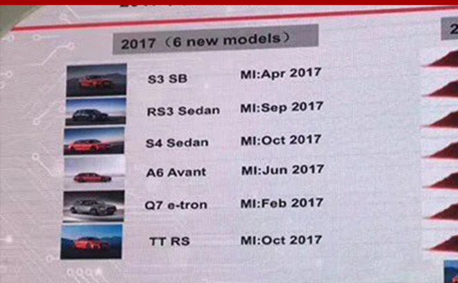從曝光的產(chǎn)品規(guī)劃來看,2017年奧迪有6款新車上市。到目前為止,奧迪Q7 e-tron和A6 Avant已經(jīng)按照規(guī)劃正式上市。原本計劃在4月上市的S3 Sportback有望三季度正式投入市場,奧迪RS 3 Sedan在9月上市,而奧迪S4 Sedan與TT RS將于今年10月上市。