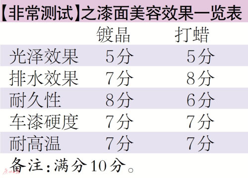 車天下君在兩塊車身試驗(yàn)面板上進(jìn)行測(cè)試,一塊鍍晶,一塊打蠟。全部按照說(shuō)明書手工操作。車天下君是個(gè)理工男,做這些事情還算是輕車熟路。完工對(duì)比光澤效果,在都沒(méi)有拋光處理的情況下,鍍晶和打蠟都沒(méi)有起到提升漆面光澤的效果,給予“不及格”的差評(píng)。潑上水,漆面都形成水珠,但仔細(xì)比較,會(huì)發(fā)現(xiàn)打蠟的排水效果比鍍晶要好。