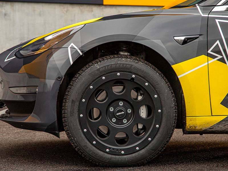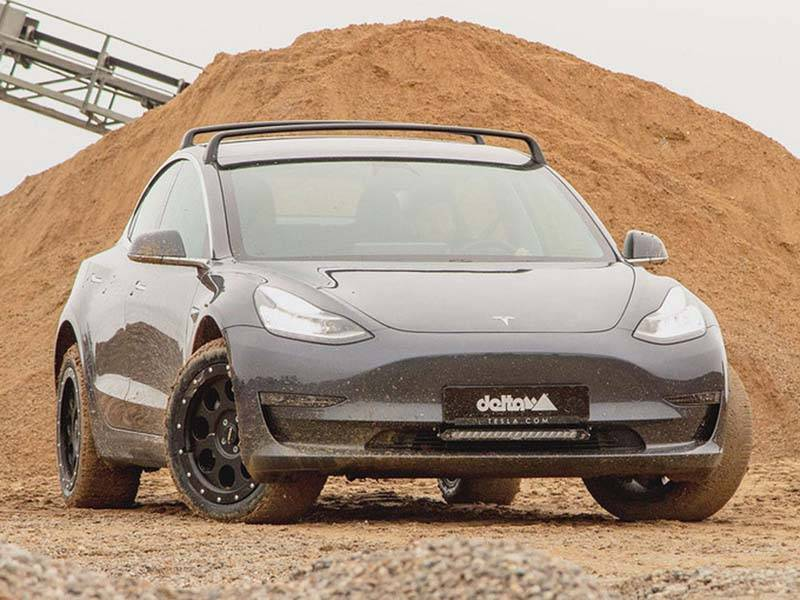 細節(jié)來看,該車由德國Delta 4×4公司打造,新車分別在四個尺寸為18×8.5的定制車輪上安裝了35毫米的舉升套件,使得Model 3具有40 mm的額外離地間隙。此外,全黑輪轂以及加裝的行李架都使Model 3顯得更加硬派。