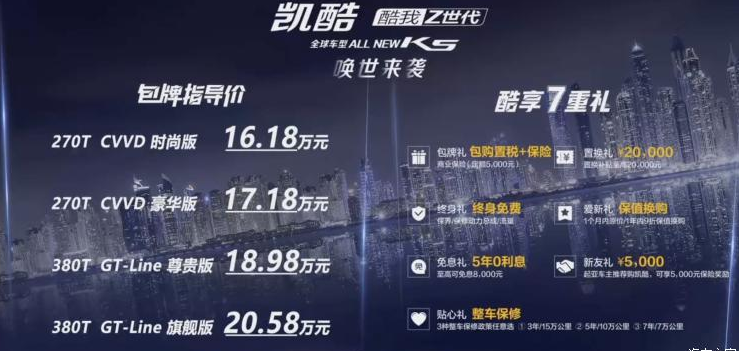 另據(jù)了解,新車指導(dǎo)價格區(qū)間為16.18-20.58萬元。起亞將這個價格稱為包牌價,是因為包括購置稅和最高5000元保險。根據(jù)官方公布的信息,截止9月6日,全新K5凱酷已經(jīng)收獲10615輛訂單。