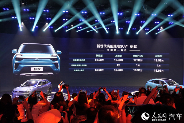 人民網(wǎng)北京9月23日電(鄂智超)日前,奇瑞新能源旗下全新純電動SUV螞蟻正式上市,今后“螞蟻”將成為奇瑞新能源旗下的完善產(chǎn)品系列。新車以“@LIFE平臺”打造,NEDC續(xù)航里程達510公里,提供聚能版、高能版、高能Pro版以及超能版四款版型,補貼后售價14.98萬元起。奇瑞汽車還宣布,螞蟻將提供終身整車質(zhì)保。