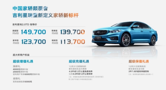 11月1日,吉利CMA超級母體首款寬體A級轎車——吉利星瑞于線上正式上市,新車全系標配2.0TD+7DCT黃金動力系統(tǒng),共推出4款車型,官方指導價為11.37萬-14.97萬元。