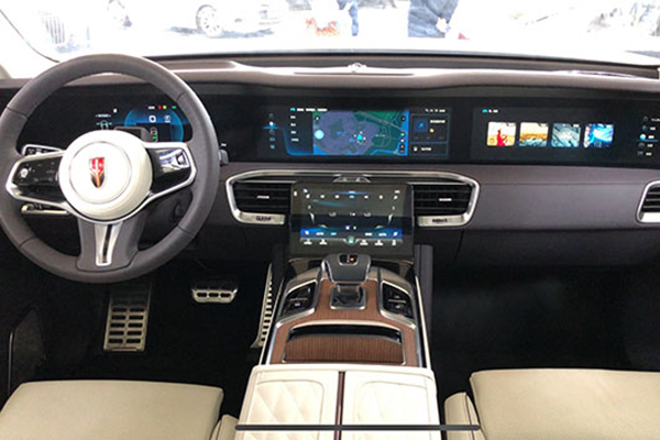 在內飾部分,紅旗E-HS9的設計處處體現“中直尚雅”、“精工致作”、“山水意境”的東方美學。對稱式的布局與故宮的中軸線設計一本同源。全液晶儀表盤、中控多媒體觸控屏、副駕駛位眼睛顯示屏的三聯屏設計,再搭配中控中間的控制面板觸摸屏,擁有四塊可觸摸大屏幕讓整車的科技感十足。當然,在后排還有座椅屏和后排中央扶手大屏。七屏娛樂系統(tǒng)在體現出科技感的同時,也兼并了舒適與豪華。