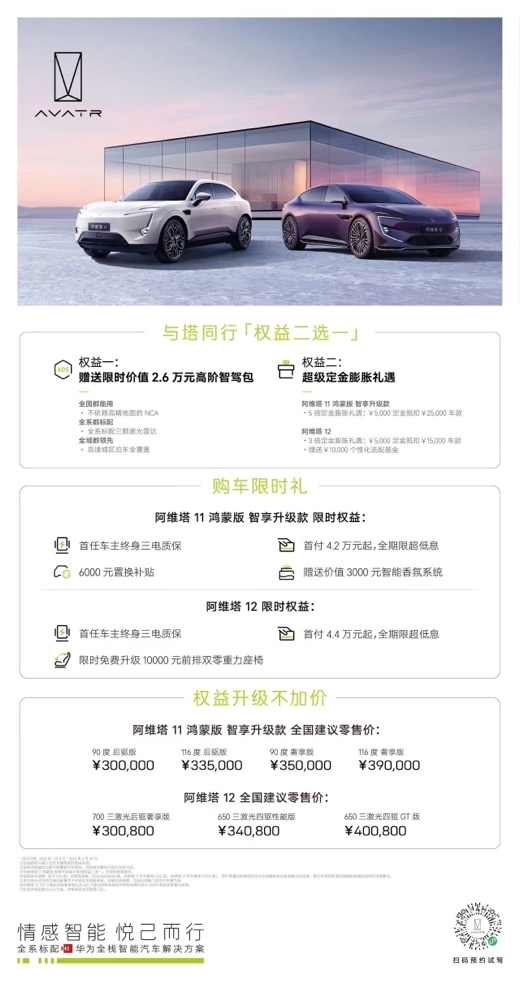 權益一,1月8日后購車的用戶贈送限時價值26,000元高階智駕包,以不依賴高精地圖的NCA帶來全域都領先的高速城區(qū)泊車全覆蓋體驗。權益二,活動期間購車用戶可享5倍定金膨脹禮遇,5000定金抵扣25,000元車款,車價立減兩萬元。與此同時,阿維塔推出更多貼心限時權益:首任車主終身三電質(zhì)保,6000元置換補貼即刻擁有;另外,全系車主可享智能香氛系統(tǒng)贈送,并擁有首付4.2萬元起、全期限超低息的購車金融權益。與此同時,阿維塔 11 鴻蒙版智享升級款全國零售價30萬- 39萬元,真正做到產(chǎn)品升級不加價。