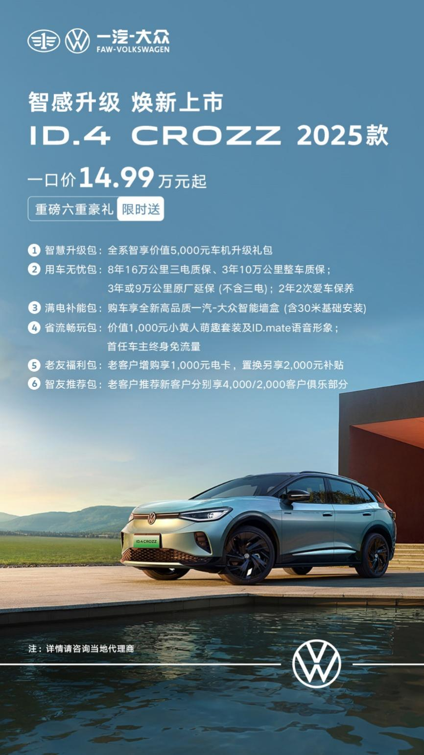 一汽-大眾ID.4 CROZZ作為MEB專屬純電平臺(tái)打造的純電汽車產(chǎn)品,憑借超高標(biāo)準(zhǔn)的整車安全、純正德系操控、真實(shí)續(xù)航及舒享空間,深受消費(fèi)者喜愛(ài)。隨著2025款產(chǎn)品的推出,一汽-大眾ID.4 CROZZ將繼續(xù)為用戶提供更安全、更可靠、更智能的電動(dòng)出行體驗(yàn),共同開啟更加美好的出行新世界。