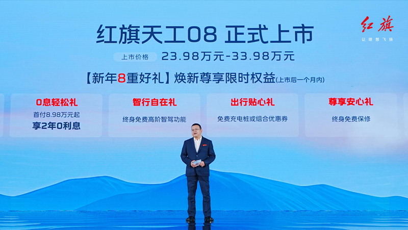 “旗創(chuàng)新高,天工逐耀”,1月7日,在長(zhǎng)春一汽研發(fā)創(chuàng)新基地舉行的“燃動(dòng)冰雪,見證‘相信’——紅旗天工08產(chǎn)品上市發(fā)布會(huì)”上,紅旗智造中大型豪華純電SUV天工08正式上市,以領(lǐng)先技術(shù)和卓越實(shí)力為用戶提供高品質(zhì)出行新選擇?;赝?024年,一汽紅旗銷量突破40萬(wàn)輛,以強(qiáng)勁增勢(shì)再攀歷史高峰。站在40萬(wàn)銷量新起點(diǎn),天工08將以進(jìn)取之姿為2025年新征程踏出堅(jiān)實(shí)首步。