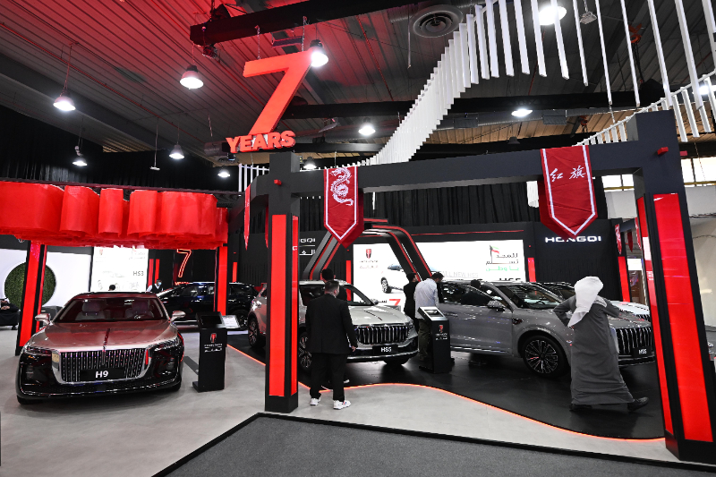 (資料圖)2月3日,在科威特哈瓦利省,人們?cè)谄囀澜缯股蠀⒂^紅旗汽車。新華社發(fā)(阿薩德攝)
