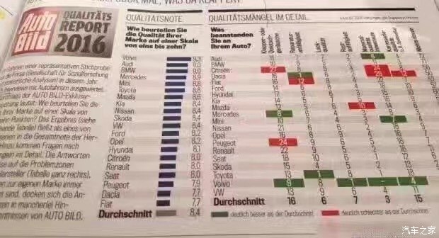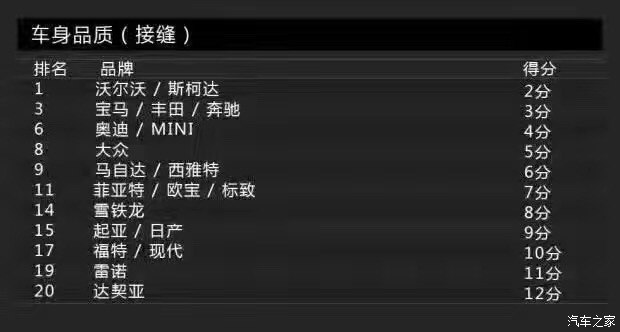 Bild調(diào)查的車身品質(zhì)(接縫)主要包括車身品質(zhì)、開(kāi)關(guān)門的手感、鋼板接縫及經(jīng)常與身體接觸的地方。沒(méi)錯(cuò),這一單項(xiàng)表現(xiàn)最佳的是沃爾沃,得分為2分。這里小編要敲黑板提醒大家注意了:在車身品質(zhì)(接縫)滿意度上,得分最低表現(xiàn)最好。當(dāng)然,斯柯達(dá)也得到了2分,寶馬、奔馳則同為3分。而得分最高的就是前面提到的達(dá)契亞,它的得分是12分,換句話說(shuō)就是達(dá)契亞是車身品質(zhì)滿意度最低的品牌。有意思的是與達(dá)契亞一起墊底是法系品牌雷諾,它的得分是11分。