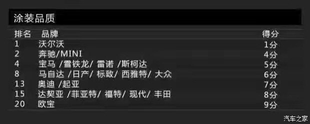再來(lái)看看涂裝品質(zhì)方面,涂裝主要包括車漆亮度與耐腐蝕性。還是老規(guī)矩,得分最低就代表消費(fèi)者滿意度最高(下同)。沃爾沃的得分為1分,依然占據(jù)榜首的位置,或許排名第二的奔馳為4分,但跟沃爾沃差距有點(diǎn)大。得分最高的則是歐寶,為9分。另外,達(dá)契亞也有8分。