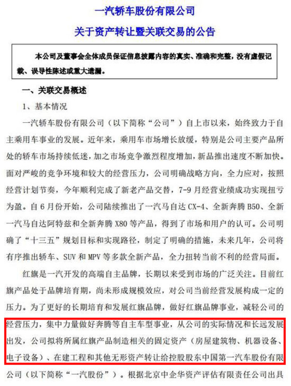 根據(jù)此前公告,一汽轎車根據(jù)資產(chǎn)評估的結(jié)果,在和一汽集團(tuán)協(xié)商一致的前提下,將評估價(jià)值為3.7億元的紅旗旗下資產(chǎn),以含增值稅人民幣 4.2億元的交易價(jià)格轉(zhuǎn)讓給一汽股份,并且表示, 本次資產(chǎn)轉(zhuǎn)讓的關(guān)聯(lián)交易已經(jīng)在第七屆董事會第七次會議中審議通過,在交易合同簽署生效后20天內(nèi)一汽股份需要向一汽轎車支付轉(zhuǎn)讓資產(chǎn)價(jià)款。這意味著,紅旗品牌已歸屬于一汽股份所有,從一汽轎車中獨(dú)立出來。(圖/文 網(wǎng)通社 陳旭明)