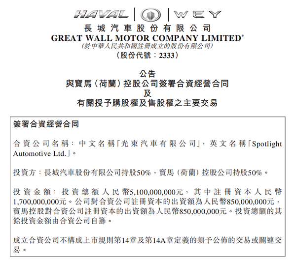 7月10日,長(zhǎng)城、寶馬正式簽署合資經(jīng)營(yíng)合同。兩家公司聯(lián)合出資51億元人民幣,成立注冊(cè)資本為17億元的光束汽車有限公司,注冊(cè)地為江蘇省張家港市。