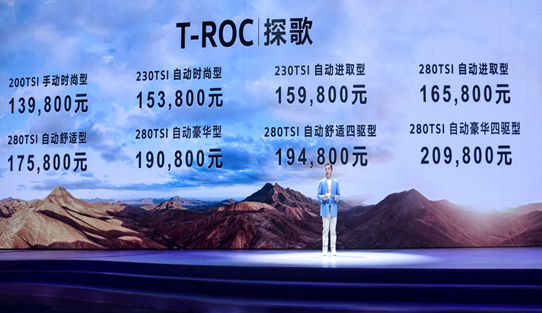 7月30日, 一汽-大眾首款SUV——T-ROC探歌在深圳上市。新車提供200TSI、230TSI和280TSI三款動力選擇,并提供四驅(qū)版本,共8款車型,售價區(qū)間13.98-20.98萬元。