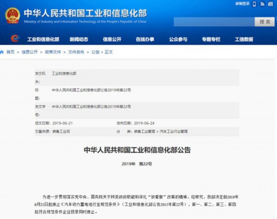6月24日,工信部正式發(fā)布了一則公告,明確表示自今年6月21日起,廢止《汽車動(dòng)力蓄電池行業(yè)規(guī)范條件》(工業(yè)和信息化部公告2015年第22號(hào)),同時(shí)廢止的還有第一、第二、第三、第四批符合規(guī)范條件企業(yè)目錄。全國(guó)乘用車市場(chǎng)信息聯(lián)席會(huì)秘書長(zhǎng)崔東樹(shù)在接受《中國(guó)汽車報(bào)》記者采訪時(shí)表示,此舉意味著,在業(yè)內(nèi)存在近4年的新能源汽車動(dòng)力電池“白名單”正式取消,國(guó)內(nèi)動(dòng)力電池領(lǐng)域?qū)⒂瓉?lái)新一輪的競(jìng)爭(zhēng)。