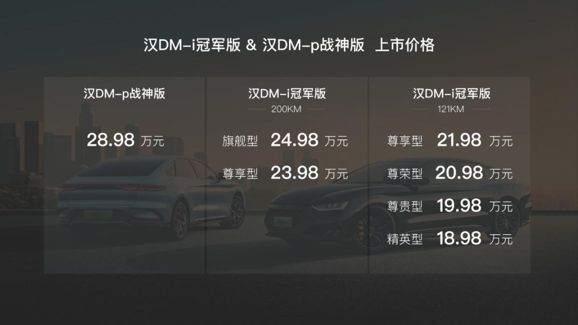 此次,產(chǎn)品實(shí)力全面進(jìn)階的漢DM系列兩款車型中,漢DM-i冠軍版的價(jià)格區(qū)間為18.98萬元~24.98萬元,漢DM-p戰(zhàn)神版的價(jià)格為28.98萬元。此外,全新漢DM系列還為用戶準(zhǔn)備了5大智聯(lián)在線服務(wù)、5大專屬貴賓服務(wù)、2大無憂購車政策等多重購車禮遇。