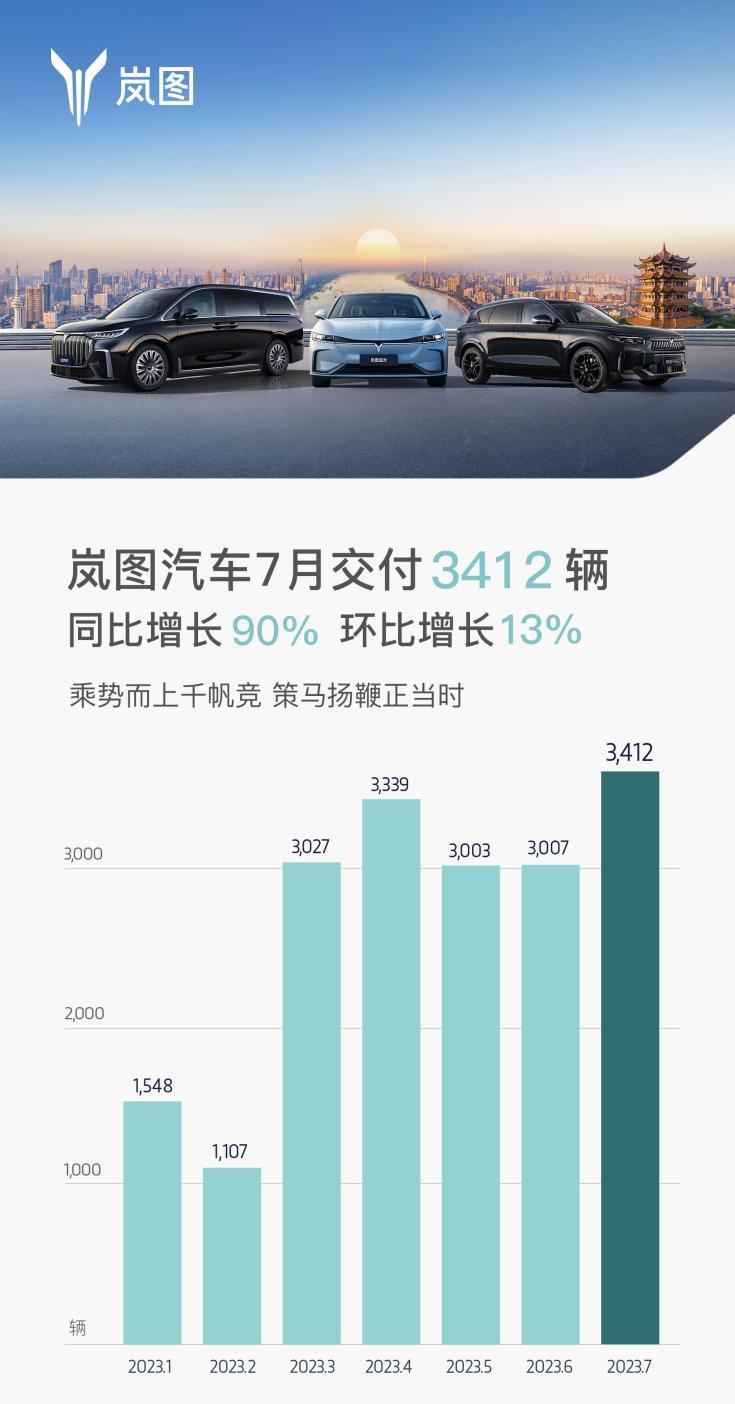 央廣網(wǎng)北京8月1日消息 今日,嵐圖汽車公布2023年7月交付數(shù)據(jù)。2023年7月,嵐圖交付新車3412輛,同比上漲90%,環(huán)比上漲13%。在競爭愈加激烈的市場競爭下,嵐圖汽車憑借其卓越的產(chǎn)品硬實力,銷量連續(xù)五個月超3000輛,潛力持續(xù)釋放。