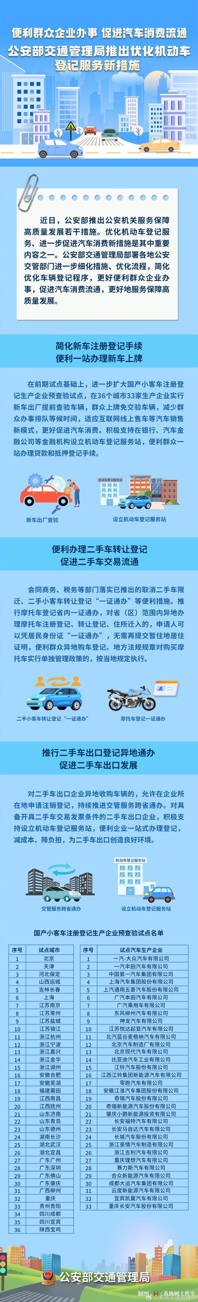 簡化新車注冊登記手續(xù),便利一站辦理新車上牌。在前期試點基礎(chǔ)上,進(jìn)一步擴大國產(chǎn)小客車注冊登記生產(chǎn)企業(yè)預(yù)查驗試點,在36個城市33家生產(chǎn)企業(yè)實行新車出廠提前查驗車輛,群眾上牌免交驗車輛,減少群眾辦事排隊等候時間,適應(yīng)互聯(lián)網(wǎng)線上售車等汽車銷售新模式,更好促進(jìn)汽車消費。積極支持在銀行、汽車金融公司等金融機構(gòu)設(shè)立機動車登記服務(wù)站,便利群眾一站辦理貸款和抵押登記手續(xù)。