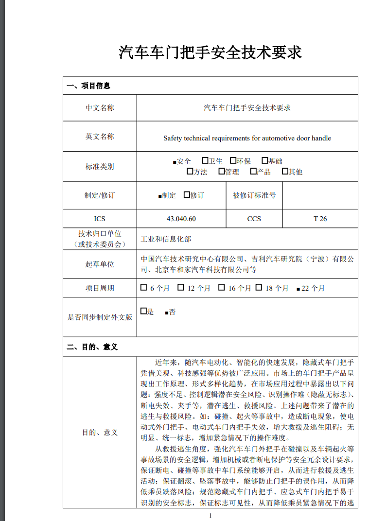 該文件中稱,近年來,隨汽車電動(dòng)化、智能化的快速發(fā)展,隱藏式車門把手憑借美觀、科技感強(qiáng)等優(yōu)勢被廣泛應(yīng)用。市場上的車門把手產(chǎn)品呈現(xiàn)出工作原理、形式多樣化趨勢,在市場應(yīng)用過程中暴露出以下問題:強(qiáng)度不足、控制邏輯潛在安全風(fēng)險(xiǎn)、識別操作難(隱蔽無標(biāo)志)、斷電失效、夾手等,潛在逃生、救援風(fēng)險(xiǎn)。上述問題帶來了潛在的逃生與救援風(fēng)險(xiǎn)。如:碰撞、起火等事故中,造成斷電現(xiàn)象,使電動(dòng)式外門把手、電動(dòng)式車門內(nèi)把手失效,增大救援及逃生阻礙;無明顯、統(tǒng)一標(biāo)志,增加緊急情況下的操作難度。