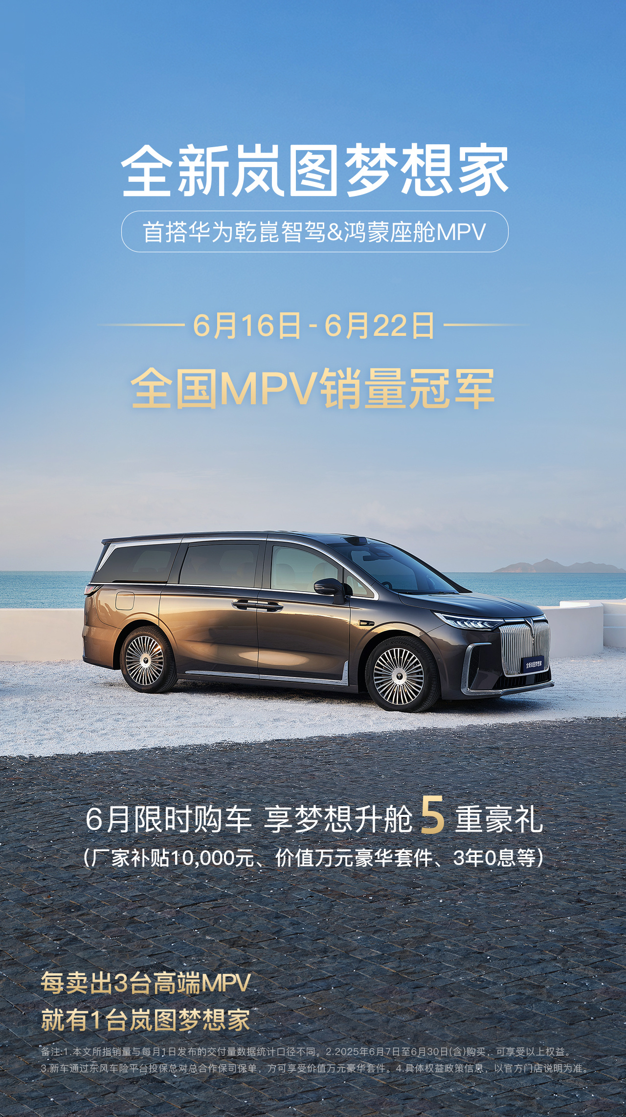 嵐圖夢(mèng)想家6月官宣限時(shí)銷售政策,立省5.5萬元現(xiàn)金以及0元升級(jí)價(jià)值萬元豪華套件,在政策與產(chǎn)品力雙重疊加下,嵐圖夢(mèng)想家成為當(dāng)下MPV市場(chǎng)熱銷產(chǎn)品。