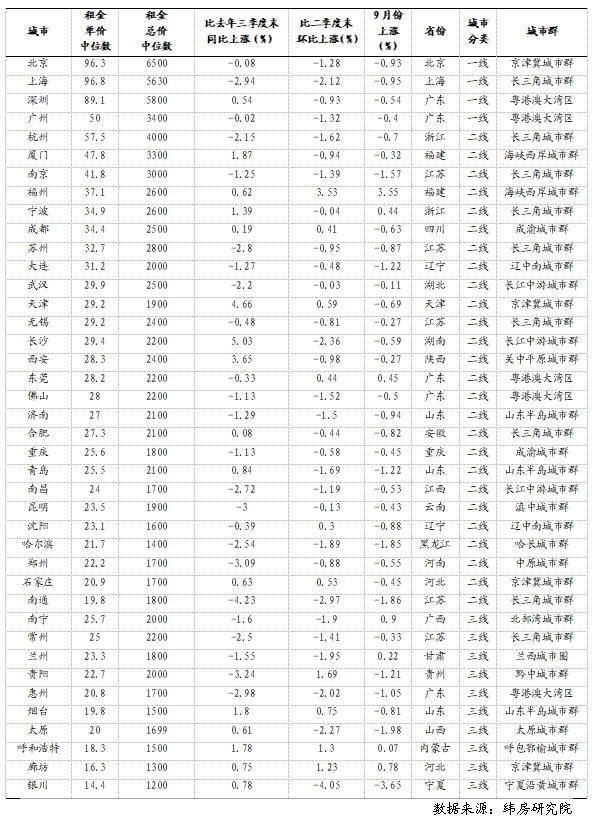 二線城市三季度住房租金掛牌價總體下降,少數(shù)城市租金微漲