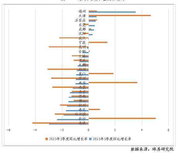 住房大數(shù)據(jù)監(jiān)測的26個二線城市中,僅有6個城市的住房租金環(huán)比上漲,20個城市的住房租金環(huán)比下跌。其中,南通和長沙降幅最高,分別為2.97%和2.36%,其余城市降幅均不超過2%;福州漲幅最高為3.53%,其余城市漲幅均不超過1%。與2022年三季度末相比,住房大數(shù)據(jù)監(jiān)測的26個二線城市中有16個城市住房租金同比下降,10個城市住房租金同比上漲。其中,南通、鄭州、昆明等城市住房租金同比跌幅最大,分別下跌4.23%、3.09%和3%;長沙、天津、西安等城市住房租金同比漲幅最大,分別上漲5.03%、4.66%和3.65%。