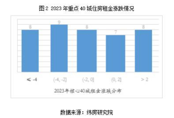 從漲跌結(jié)構(gòu)看,緯房研究院數(shù)據(jù)顯示,2023年重點(diǎn)40城中有15個城市住房租金同比上漲,其余25個城市住房租金同比下降。住房租金上漲的城市中,7個城市漲幅在2%以內(nèi),8個城市漲幅超過2%;住房租金下跌的城市中,8個城市跌幅在2%以內(nèi),9個城市跌幅在2-4%;8個城市跌幅超過4%。
