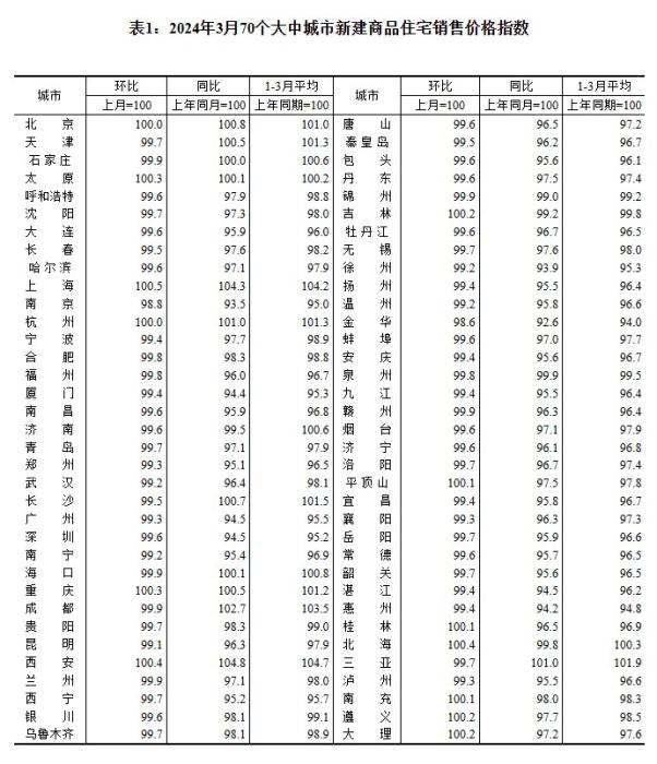 2024年3月70個(gè)大中城市新建商品住宅銷售價(jià)格指數(shù)。 截圖自國(guó)家統(tǒng)計(jì)局官網(wǎng) 新房?jī)r(jià)格上漲城市數(shù)量增加 房?jī)r(jià)上漲城市數(shù)量的增加從很大程度上體現(xiàn)了市場(chǎng)的變化。梳理發(fā)現(xiàn),3月份新房?jī)r(jià)格上漲的城市數(shù)量有所增加,從2月份的8個(gè)增至11個(gè)。 “房?jī)r(jià)上漲城市數(shù)量增加,充分說明部分城市開始率先進(jìn)入到樓市基本面修復(fù)、價(jià)格指標(biāo)向好調(diào)整的階段。”易居研究院研究總監(jiān)嚴(yán)躍進(jìn)表示。 廣東省城規(guī)院住房政策研究中心首席研究員李宇嘉提出,上海、西安、北海、太原、重慶漲幅居前,主要是改善盤推盤價(jià)格上升所致。 再看具體的價(jià)格變動(dòng),一線城市新建商品住宅銷售價(jià)格環(huán)比下降0.1%,降幅比上月收窄0.2個(gè)百分點(diǎn),其中,北京持平,上海上漲0.5%,廣州和深圳分別下降0.7%和0.4%。二、三線城市新建商品住宅銷售價(jià)格環(huán)比分別下降0.3%和0.4%,降幅均與上月相同。 “從新房來看,一線城市的下降幅度明顯收窄,其中北上的穩(wěn)定性表現(xiàn)得更好?!?8安居客研究院院長(zhǎng)張波認(rèn)為,二三線城市中重慶、西安、吉林等地的房?jī)r(jià)環(huán)比出現(xiàn)上漲,更多也是受供給結(jié)構(gòu)影響。 張波還表示,從安居客監(jiān)測(cè)的數(shù)據(jù)來看,3月份重點(diǎn)65城新房新開盤數(shù)量環(huán)比大漲155%,其中一線城市環(huán)比漲幅更是接近350%,新房存量規(guī)模小幅上升。3月房企加大優(yōu)惠促銷力度。 “新房市場(chǎng)如果能夠在高端盤的帶動(dòng)下,在前期二手房的消化下,能夠帶動(dòng)需求入市可能會(huì)有企穩(wěn)的跡象?!崩钣罴握J(rèn)為。