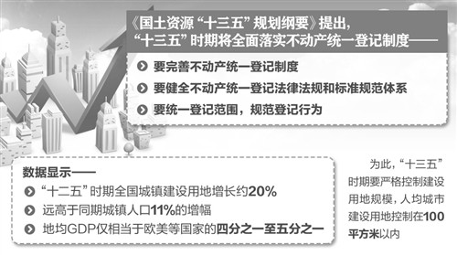 國土資源部今天公布的《國土資源“十三五”規(guī)劃綱要》提出,“十三五”時期將全面落實不動產統(tǒng)一登記制度。