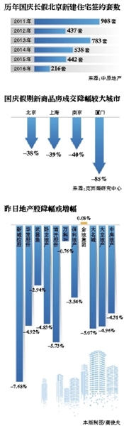 北京在9月30日出臺的政策影響了市場熱度,市場進入了急速冷凍階段。中原地產(chǎn)研究中心統(tǒng)計數(shù)據(jù)顯示,2016年國慶長假期間,7天北京新建住宅簽約216套,二手房住宅簽約209套。合計簽約425套。而2015年國慶7天簽約為543套。從簽約數(shù)據(jù)看,北京新建住宅成交量為2011年來6年最低點。對此,中原地產(chǎn)首席分析師張大偉分析認為,預計北京房價將快速降溫,四季度漲幅將明顯放緩,在自住房大量供應后,部分區(qū)域的價格很可能出現(xiàn)調(diào)整。