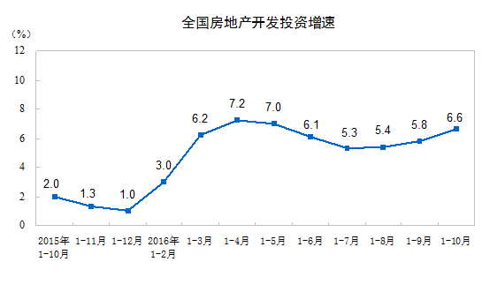 2016年1-10月份,全國(guó)房地產(chǎn)開發(fā)投資83975億元,同比名義增長(zhǎng)6.6%,增速比1-9月份提高0.8個(gè)百分點(diǎn)。其中,住宅投資56294億元,增長(zhǎng)5.9%,增速提高0.8個(gè)百分點(diǎn)。住宅投資占房地產(chǎn)開發(fā)投資的比重為67.0%。