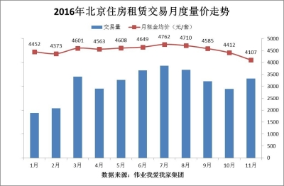 按照慣例,10月之后北京租賃市場(chǎng)進(jìn)入傳統(tǒng)淡季,剛剛過去的11月,北京月租金均價(jià)創(chuàng)年內(nèi)新低。據(jù)偉業(yè)我愛我家集團(tuán)市場(chǎng)研究院統(tǒng)計(jì),2016年11月,北京區(qū)域通過我愛我家達(dá)成的住宅租賃交易量環(huán)比10月同期上漲14.8%,但月租金均價(jià)為4107元/平米,環(huán)比10月下跌6.9%。