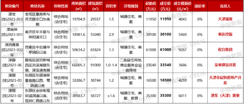 此外,津靜(掛)2023-06號(hào)地塊位于靜海區(qū)團(tuán)泊新城西區(qū)洪澤湖路東側(cè)、津澤道南側(cè),由天津市榮泰建設(shè)開(kāi)發(fā)有限公司底價(jià)3.354億摘得,樓面價(jià)3686元/㎡。津南保(掛)2023-031號(hào)地塊位于南開(kāi)區(qū)年豐路與保陽(yáng)道交口,為南開(kāi)天拖城市更新地塊,由泰達(dá)控股起始價(jià)3.01億元摘得,樓面價(jià)5469元/㎡。津?qū)?掛)2023-013號(hào)地塊位于寶坻區(qū)幸福路與景苑街交口西南角,由天津瑞賽起始價(jià)1.195億元摘得,樓面價(jià)4043元/㎡。