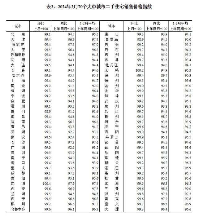 2024年2月70個(gè)大中城市二手住宅銷售價(jià)格指數(shù)。 截圖自國(guó)家統(tǒng)計(jì)局官網(wǎng)
