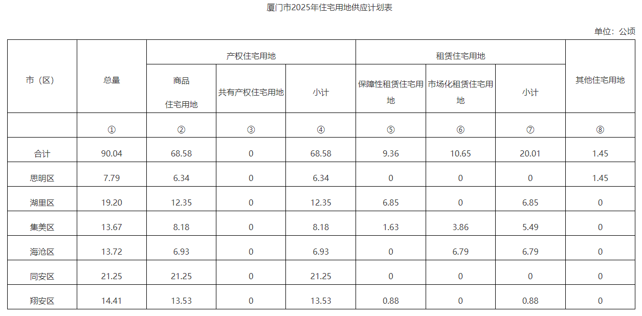 從住宅用地總量和結(jié)構(gòu)來看,2025年廈門市住宅用地計(jì)劃供應(yīng)90公頃,其中產(chǎn)權(quán)住宅用地69公頃(商品住宅用地69公頃,共有產(chǎn)權(quán)住宅用地0公頃),租賃住宅用地20公頃(保障性租賃住宅用地9公頃,市場化租賃住宅用地11公頃),其他住宅用地(拆遷安置房)1公頃。