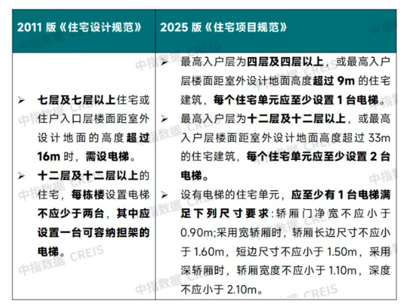 電梯設置方面,新版《住宅項目規(guī)范》降低了電梯設置的樓層要求,從原規(guī)定“七層及以上需設電梯”調整為“四層及以上需設電梯”。