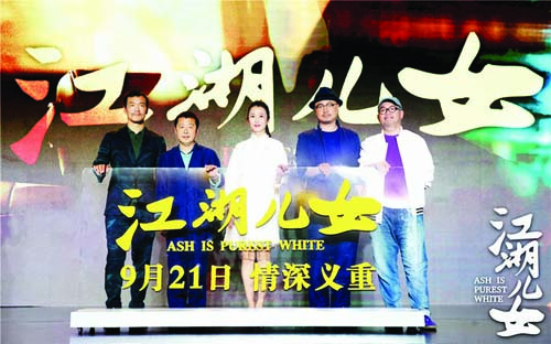 《江湖兒女》由上影集團(tuán)、北京西河星匯、歡喜傳媒、法國(guó)MK2、北京潤(rùn)錦投資、無(wú)限自在傳媒及歌童映畫聯(lián)合出品,片方在當(dāng)天發(fā)布會(huì)上公布了定檔預(yù)告片和兩款定檔海報(bào),伴隨著緊湊的節(jié)奏,“咱們是哪種人?”“江湖上的人?!眱删鋽S地有聲的臺(tái)詞將人拉入這場(chǎng)江湖風(fēng)暴,金錢、暴力、兒女情長(zhǎng)隨之展開;海報(bào)則一款整體色調(diào)偏暗,風(fēng)雨欲來(lái),另一款則色調(diào)明亮,情深意切,雖然色調(diào)、構(gòu)圖和氛圍各不相同,但巧巧與斌哥愛情故事中的狂風(fēng)暴雨與江湖氣盛兒女情長(zhǎng)同樣呼之欲出,動(dòng)人心魄。