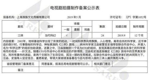 到了今年,國(guó)家廣播電影電視總局5月電視劇備案公示顯示,《三體》將被改編為電視劇,并已通過(guò)備案。電視劇將于9月開拍,共24集。
