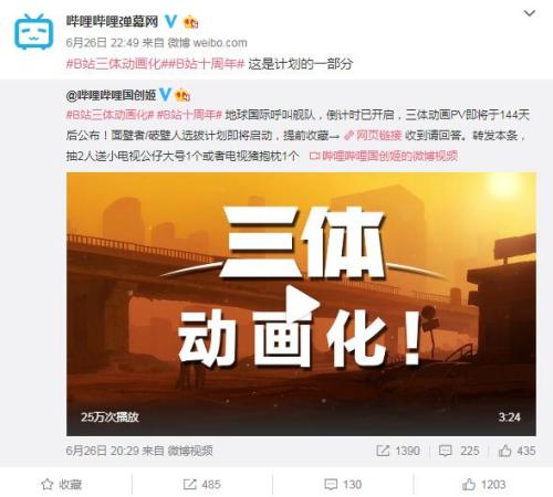 B站宣布《三體》動(dòng)畫化。微博截圖