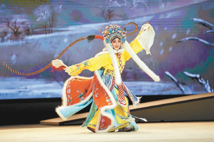 雖然以傳統(tǒng)戲為主,但是可以看出來這部戲力圖呈現(xiàn)四大美人與眾不同的一面。風雷京劇團團長松巖表示,他們希望不再是簡單地平面化呈現(xiàn)四大美人的外貌之美,而是要彰顯她們的精神之美,“從我個人情感來講,王昭君不只是一個簡單的美人,更是一個偉大的使者?!痹谖枧_呈現(xiàn)上,雖然有儀仗隊前來送行,但儀仗隊待在角落,王昭君則獨自站在風雪中,“她心里凄涼,但又懷著為祖國、為和平奉獻力量的熱情?!彼蓭r說,他希望通過京劇表演和音樂、多媒體手段的結合,讓觀眾不僅能夠欣賞京劇的唱念做打,還能感受到傳統(tǒng)京劇舞臺上感受不到的真情實景的氛圍。